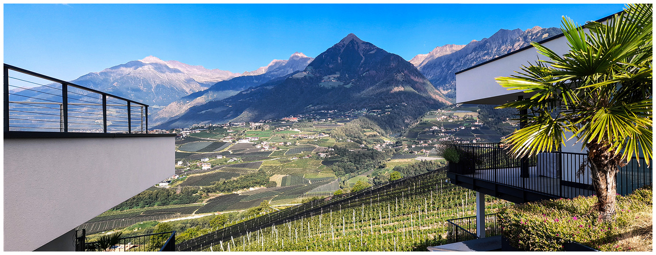 Weintrauben zum Greifen nahe: Hanglage in Schenna/Südtirol, mit Blick auf Meran und "Dorf Tirol". Composing aus 2 Smartphone-Aufnahmen